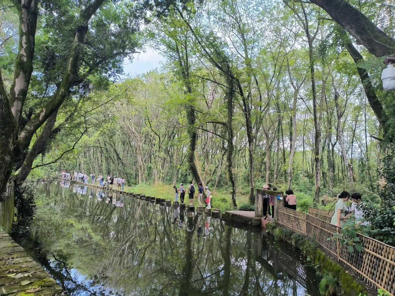 游客在西溪南古村落依次体验古代汀步。