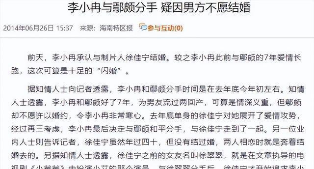 据说是鄢颇还不想结婚,以至于李小冉为他流了两次产 ,最后被她的“男闺蜜”徐佳宁撬走结了婚。