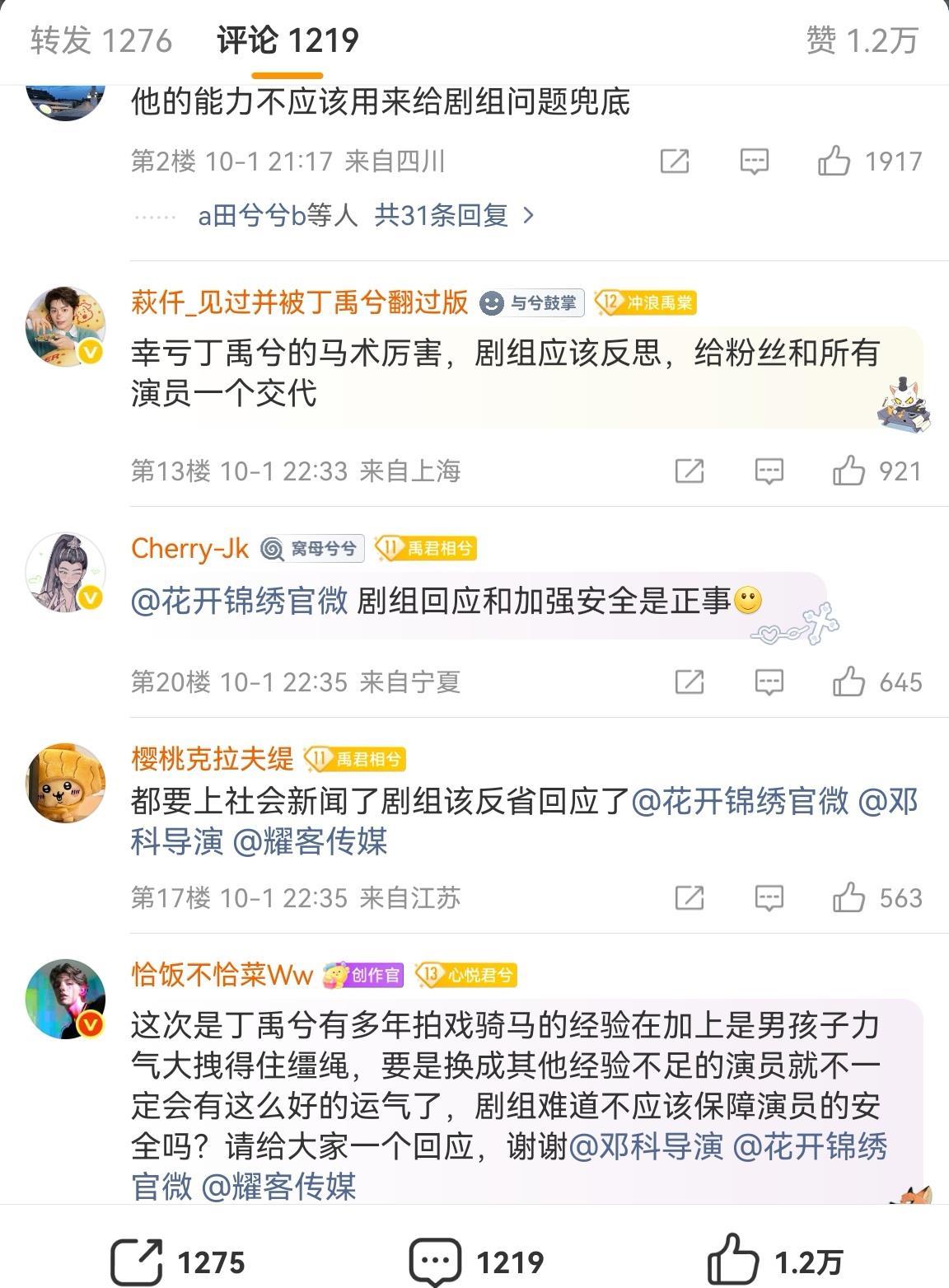 不过,也有网友质疑,所幸丁禹兮有一定骑马经验,才能临危不乱及时控马。但他的能力不应该用来给剧组问题兜底。驯养不到位的马匹参与拍摄工作,现场刺激源未控制到位,事故发生后也没有专业人员介入处理……以上种种问题叠加怎么能不令人担心,请剧组重视这一系列问题,制定更加完善的防患措施,始终做到把演员的安全问题放在第一位。